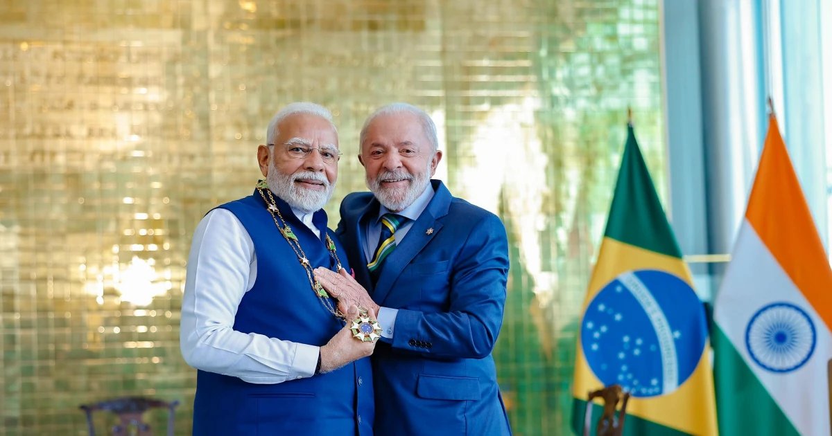 O presidente Lula (dir.) e o primeiro-ministro da Índia, Narendra Modi (esq.)
